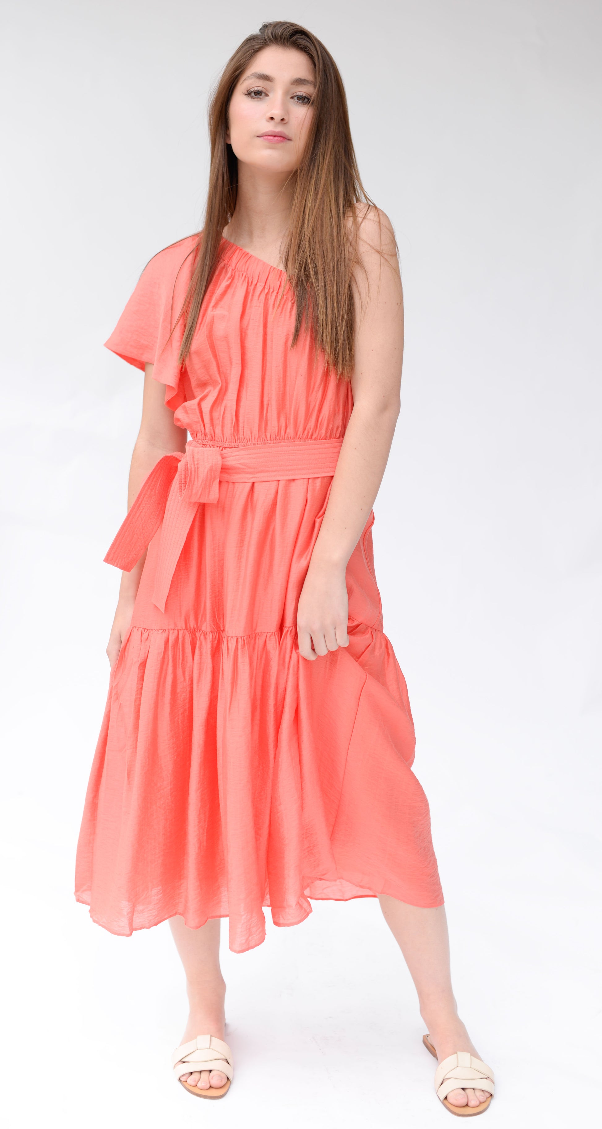 Ruffle Puff One Shoulder SSLV W/ Tiered Skirt And Self Tie